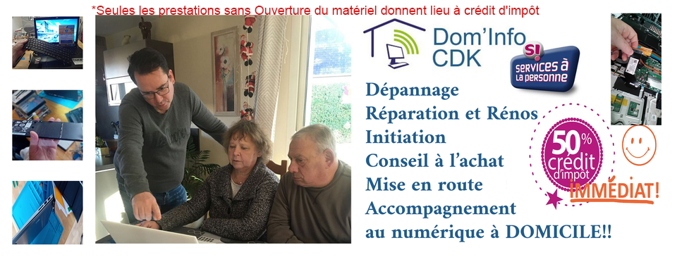 M. Baptiste BOUDEAU dépanne, rénove, équipe et initie A DOMICILE ,c'est DOM'INFO le dépannage à domicile - LE SERVICE A LA PERSONNE EN PLUS!! (Seules les prestations sans Ouverture du matériel donnent lieu à crédit d'impôt)
