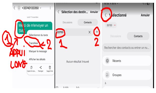 Appuyez longuement sur le message frauduleux, jusqu’à ce qu’il soit sélectionné par votre téléphone. Cliquez ensuite sur les trois points verticaux situés en haut à droite de votre écran puis sélectionnez « transférer ». Il vous suffira ensuite d’indiquer 33700 comme destinataire pour que le message soit transmis au service.