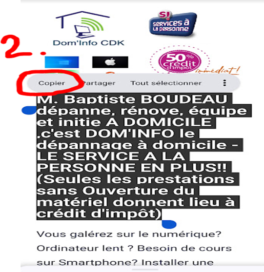Objectif récupérer tout le texte du titre : « M. Baptiste BOUDEAU dépanne, rénove, équipe et initie A DOMICILE, … crédit d’impôt) »